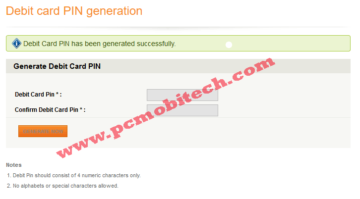 - On next you will need to create a new Debit Card PIN. So Enter a new 4 digit ATM/Debit Card and confirm by re-entering same PIN. After this click on Generate Now Button.