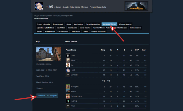 - Now here you will see all your recently played CS2 game data including Competivive matches, Scrimmage Matches (Private MM), Wingman matches, Operation mm, Casual Matches and many more.